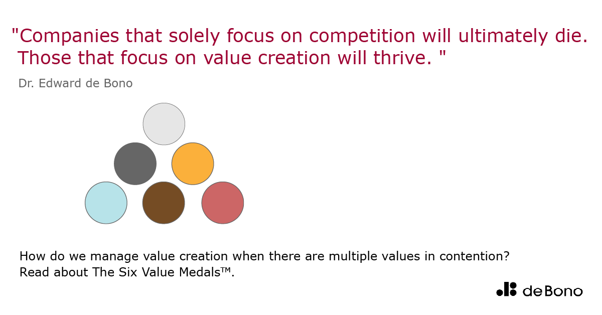 You may copy and republish this article and excerpts of it royalty free, on the condition that you link to www.deBono.com and state " Republished under licence from the copyright holder deBono.com. Find out more about the Six Value Medals™".